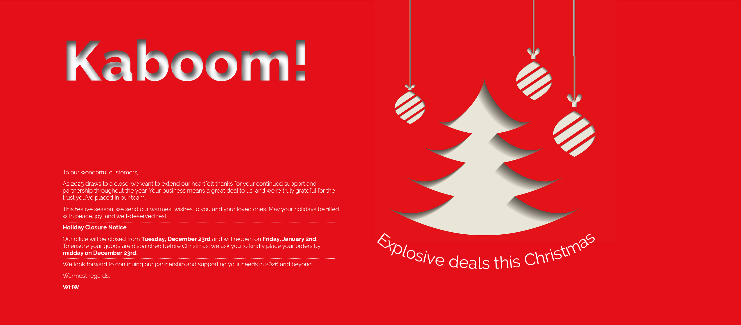 As a family-run business, WHW has always considered its customers to be a part of the family, no matter how much the company may expand. We thank you for your loyalty, your business and friendship.