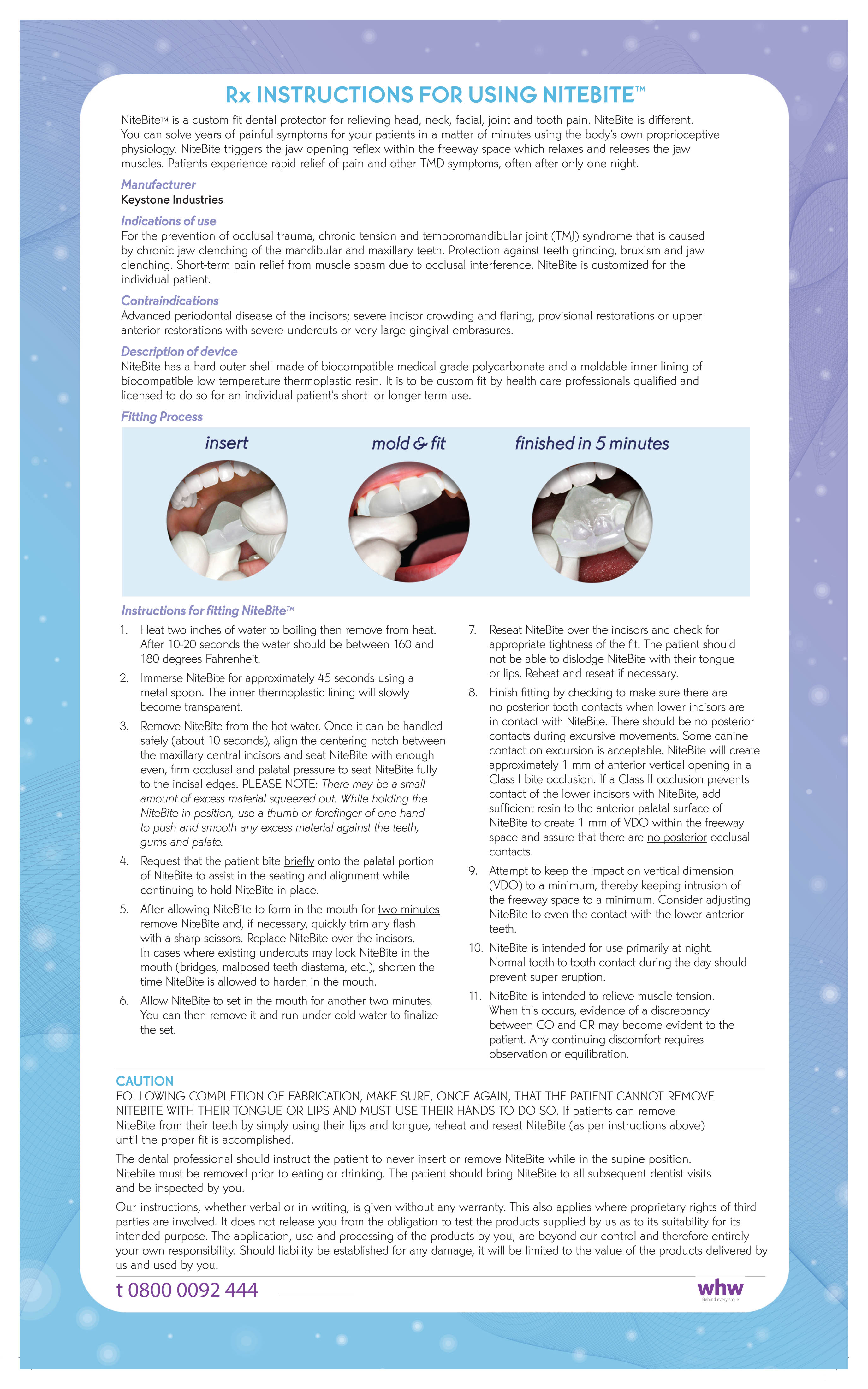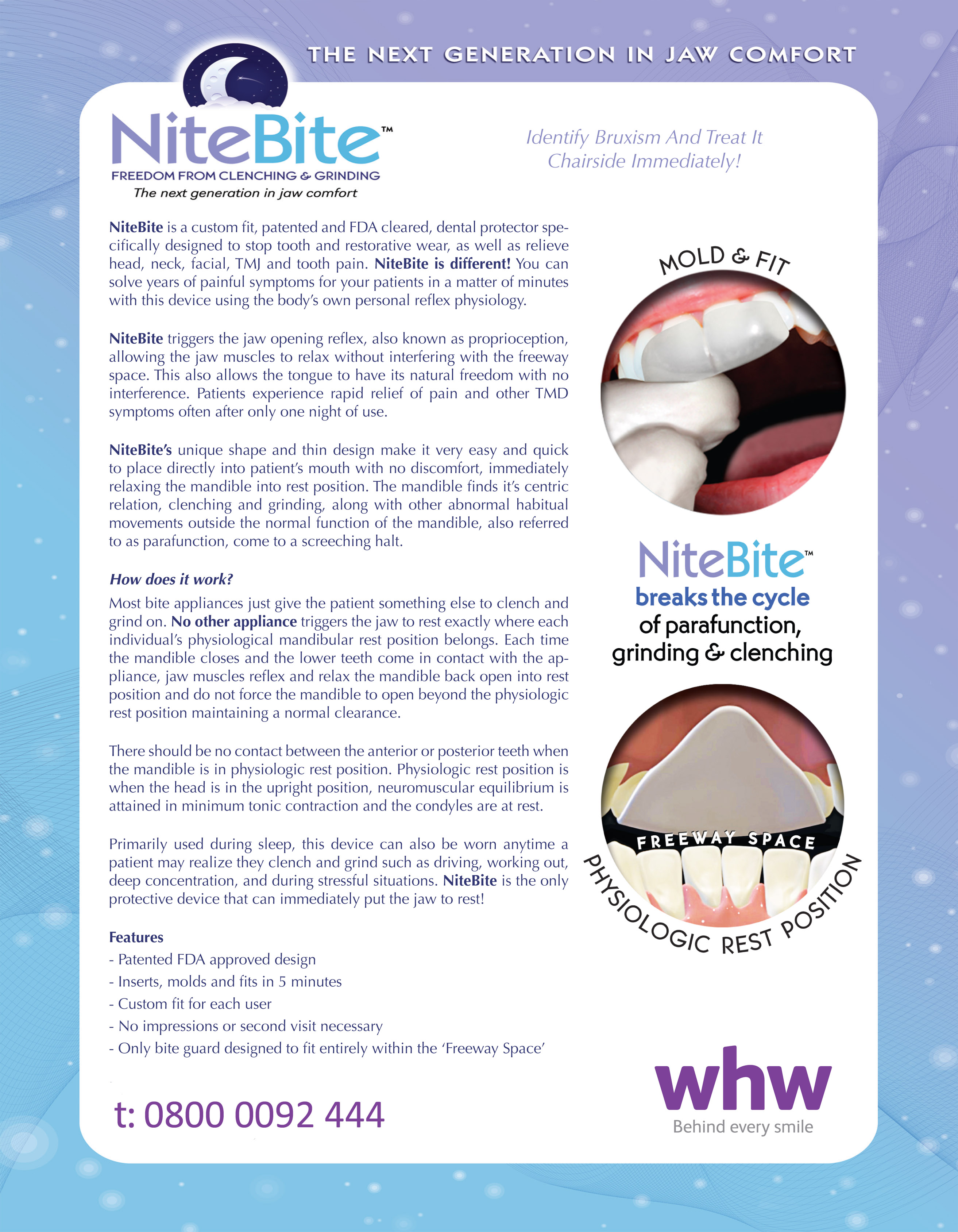 A custom fit dental protector for relieving head, neck, facial, joint and tooth pain often associated with TMJ disorder. The unique shape and thin design of NiteBite™ triggers the jaw opening reflex within the freeway space, which relaxes and releases the jaw muscles.
